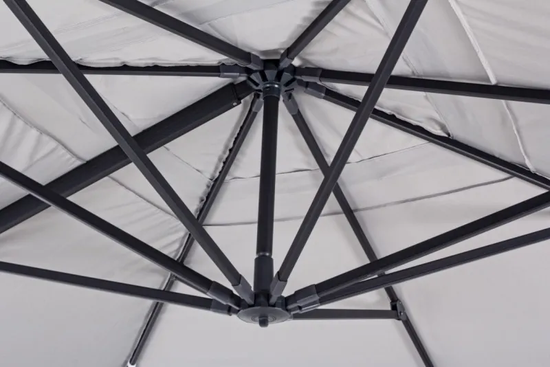 STRUTTURA IN ALLUMINIO VERNICIATA A POLVERE (POLIESTERE). PALO 93X57MM. 8 STECCHE 28X18MM. TELO GRIGIO CHIARO IN POLIESTERE 250GR/M2 CON RIVESTIMENTO IN PA (POLIAMMIDE) CON CAMINO ANTIVENTO. BASE A CROCE IN ACCIAIO. PALO GIREVOLE 360° CON PEDALINA. INCLINAZIONE VERTICALE CON IMPUGNATURA A 4 POSIZIONI. DOTATO DI MANIGLIA PER INCLINAZIONE OMBRELLO DESTRA-SINISTRA. COMPRENSIVO DI
