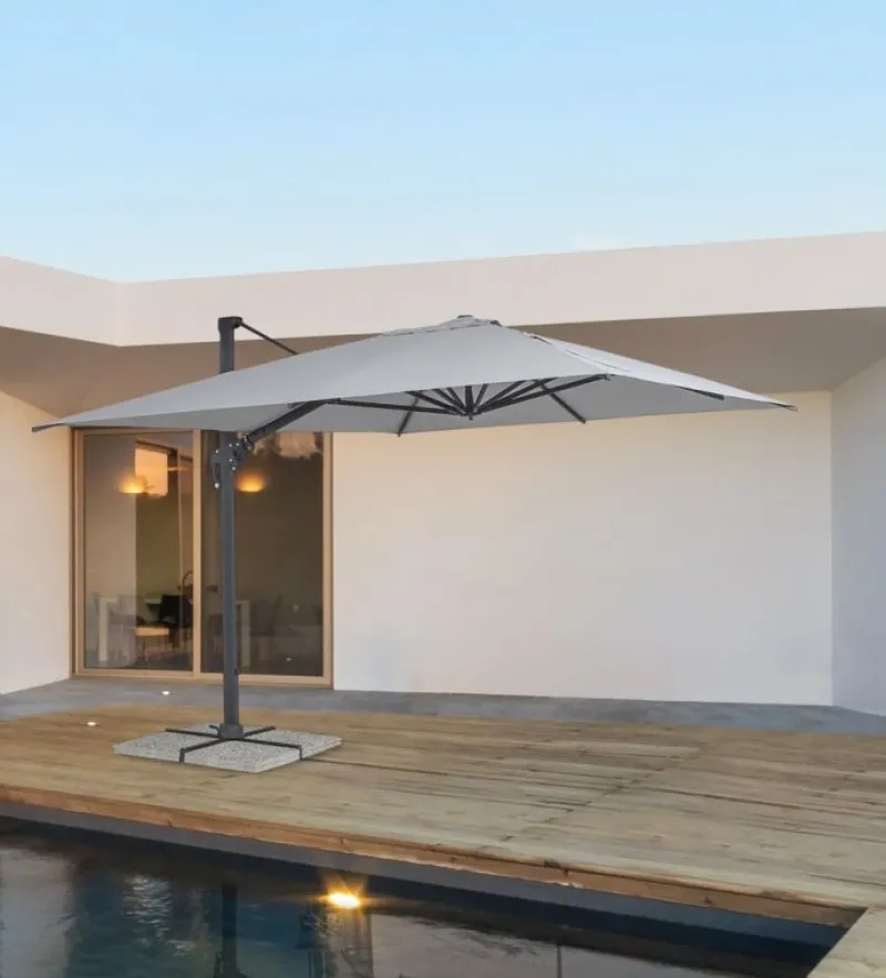 STRUTTURA IN ALLUMINIO VERNICIATA A POLVERE (POLIESTERE). PALO 93X57MM. 8 STECCHE 28X18MM. TELO GRIGIO CHIARO IN POLIESTERE 250GR/M2 CON RIVESTIMENTO IN PA (POLIAMMIDE) CON CAMINO ANTIVENTO. BASE A CROCE IN ACCIAIO. PALO GIREVOLE 360° CON PEDALINA. INCLINAZIONE VERTICALE CON IMPUGNATURA A 5 POSIZIONI. COMPRENSIVO DI COPRIOMBRELLONE. MARMETTE NON INCLUSE. PREDISPOSIZIONE LAMPADA LED