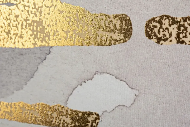 STAMPA SU TELA CON APPLICAZIONI FOGLI DORATI, MDF.
