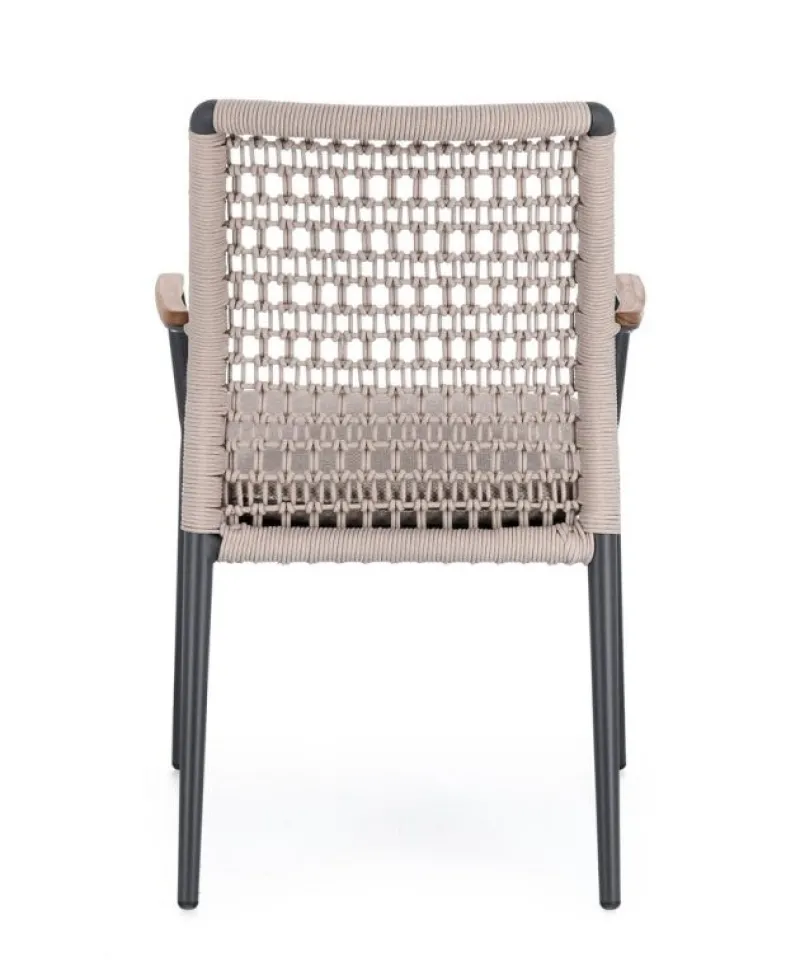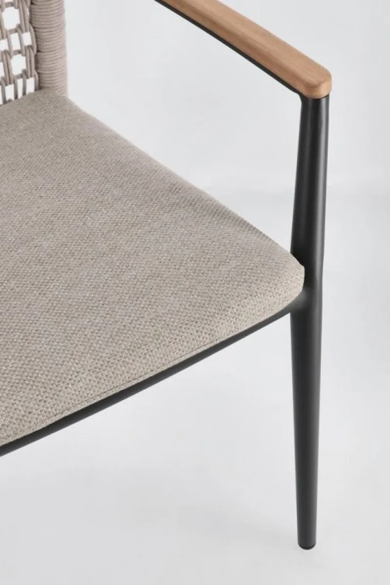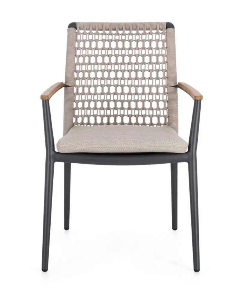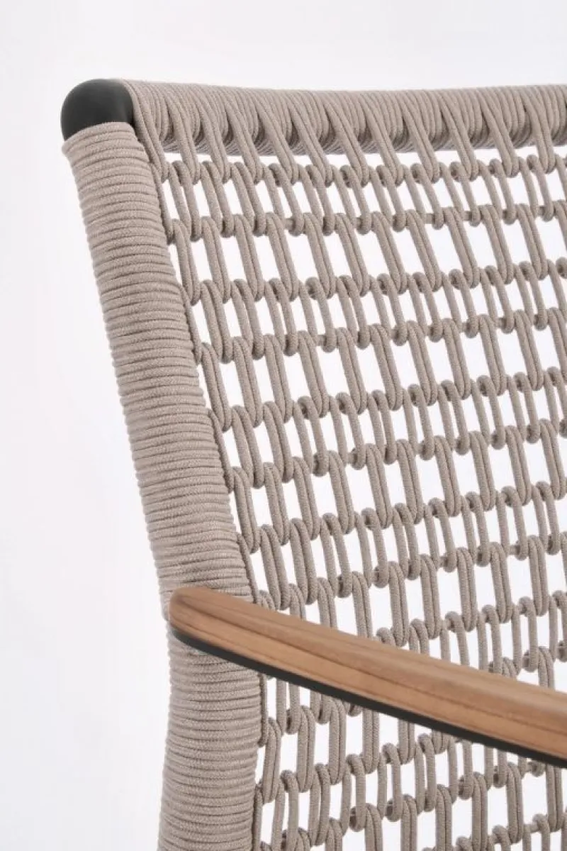 STRUTTURA IN ALLUMINIO VERNICIATA A POLVERE (POLIESTERE).BRACCIOLI CON INSERTI IN TEAK. INTRECCIO IN CORDA OLEFIN. CUSCINO SFODERABILE CON TESSUTO IDROREPELLENTE OLEFIN (100% POLIPROPILENE). IMPILABILE. NON VENDIBILE IN GERMANIA, AUSTRIA, SVIZZERA, PAESI BASSI E LUSSEMBURGO.