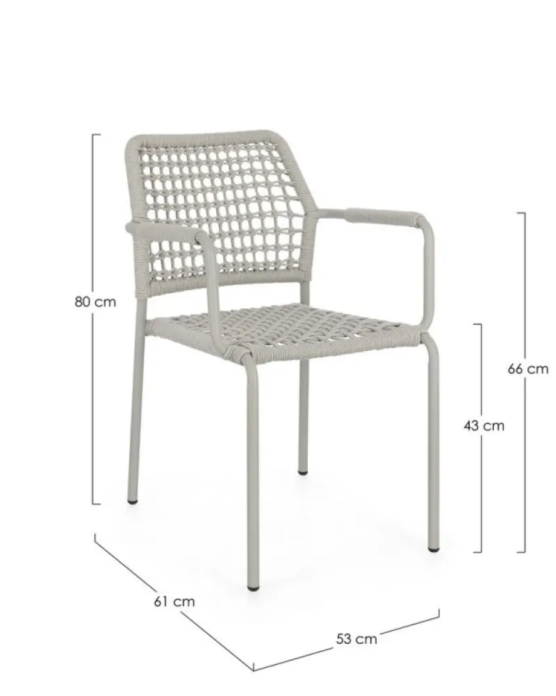 STRUTTURA IN ALLUMINIO VERNICIATA A POLVERE (POLIESTERE). INTRECCIO PER ESTERNO IN CORDA POLIESTERE. IMPILABILE.