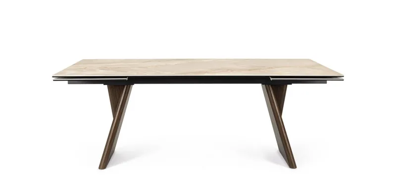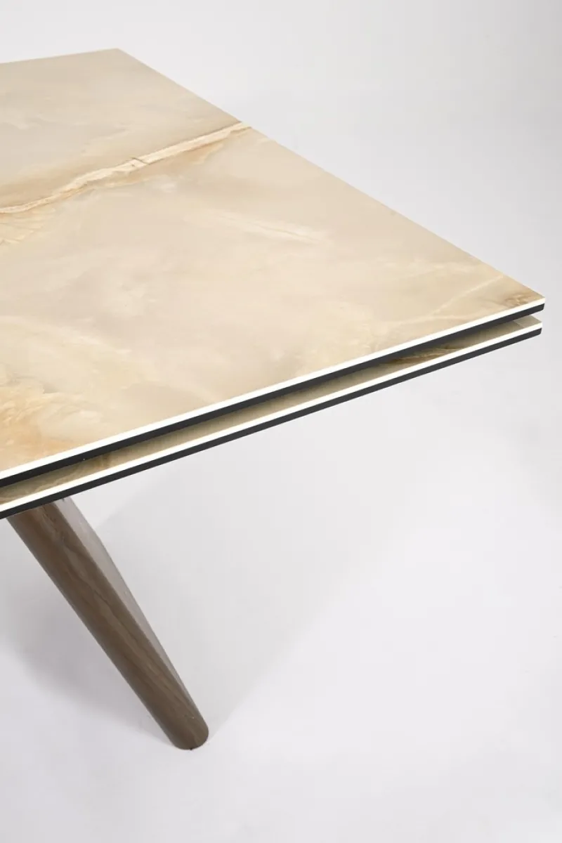 PIANO IN CERAMICA CON EFFETTO ONICE LUCIDO E STRATO INFERIORE PIANO IN VETRO TEMPERATO SUPPORTO PIANO IN ACCIAIO VERNICIATO A POLVERE EPOSSIDICA. GAMBE IN LEGNO DI BETULLA IMPIALLACCIATO LEGNO DI NOCE. PROLUNGHE INDIPENDENTI. PIEDINI REGOLABILI. GAMBE DA ASSEMBLARE.