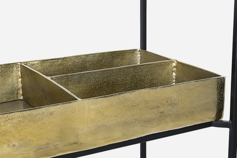 STRUTTURA IN ACCIAIO VERNICIATA A POLVERE EPOSSIDICA. PIANO SUPERIORE IN VETRO TEMPERATO. PIANO INFERIORE CON CONTENITORE IN ALLUMINIO CON FINITURA PLACCATA OTTONE ED ANTICATA.