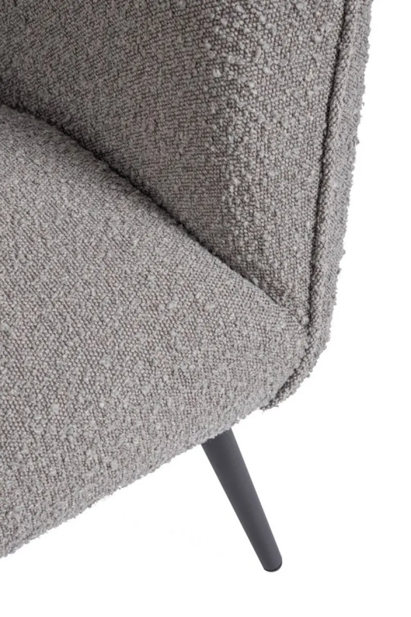 STRUTTURA IN LEGNO COMPENSATO, GAMBE IN ACCIAIO VERNICIATO A POLVERE EPOSSIDICA. RIVESTIMENTO IN POLIESTERE EFFETTO BOUCLE’. DENSITA’ IMBOTTITURA SEDUTA 28KG/M3 SCHIENALE 20KG/M3. NON SFODERABILE. GAMBE DA ASSEMBLARE.