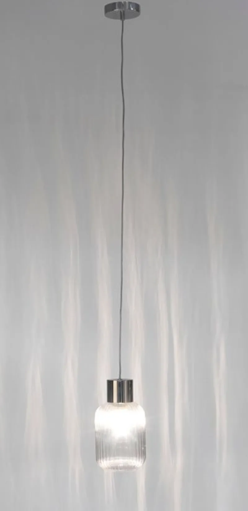ACCIAIO FINITURA CROMATA. PARALUME IN VETRO. LAMP. E27 MAX 60W, E27 11W COMP. FLUOR INTEGR. RISP. EN. , E27 42W ALOG. RISP. EN. LAMPADINA/E NON INCLUSA/E. LUNGHEZZA CAVO: 1.2 MT. DA ASSEMBLARE