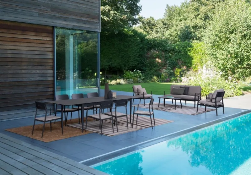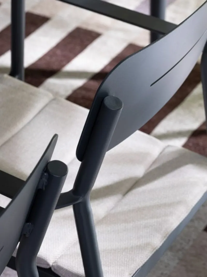 STRUTTURA IN ALLUMINIO VERNICIATO A POLVERE (POLIESTERE). CUSCINO SEDUTA NON SFODERABILE CON TESSUTO IDROREPELLENTE OLEFIN (100% POLIPROPILENE). IMPILABILE.