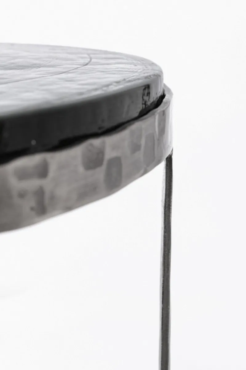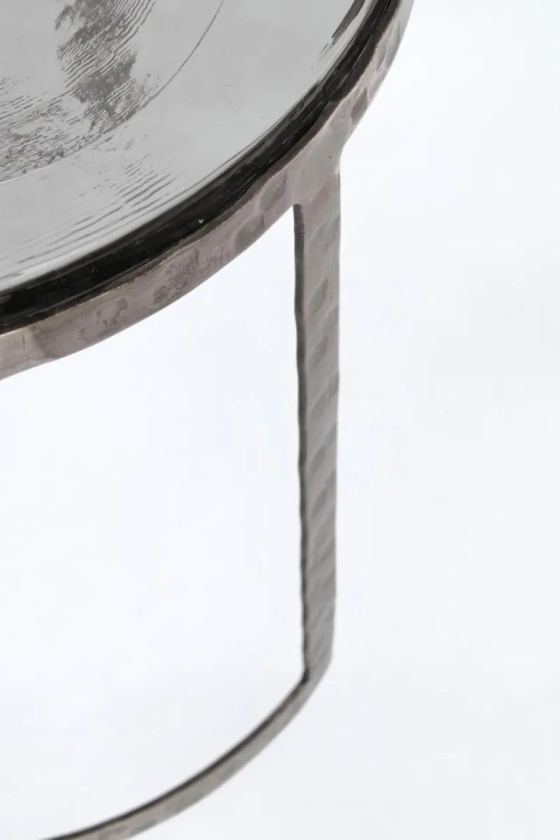 ACCIAIO CON FINITURA MARTELLATA, PLACCATA ED ANTICATA. PIANO IN VETRO NATURALE LAVORATO A MANO (SPESSORE 15-18MM). LE FORME ORIGINALI CREATE DAL VETRO SONO SOLO INDICATIVE, TUTTI I PRODOTTI SARANNO DIVERSI L’UNO DALL’ALTRO, CON MISURE E COLORAZIONI LEGGERMENTE DIFFERENTI.