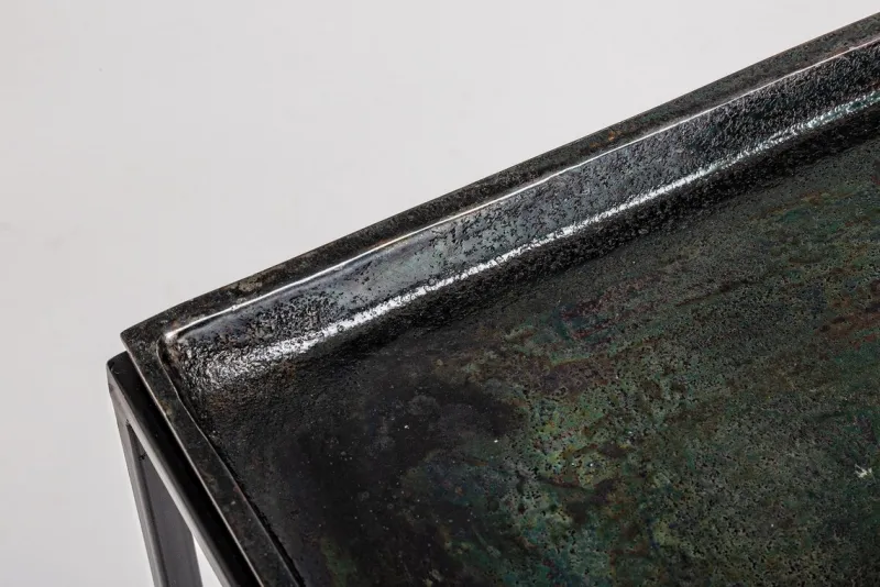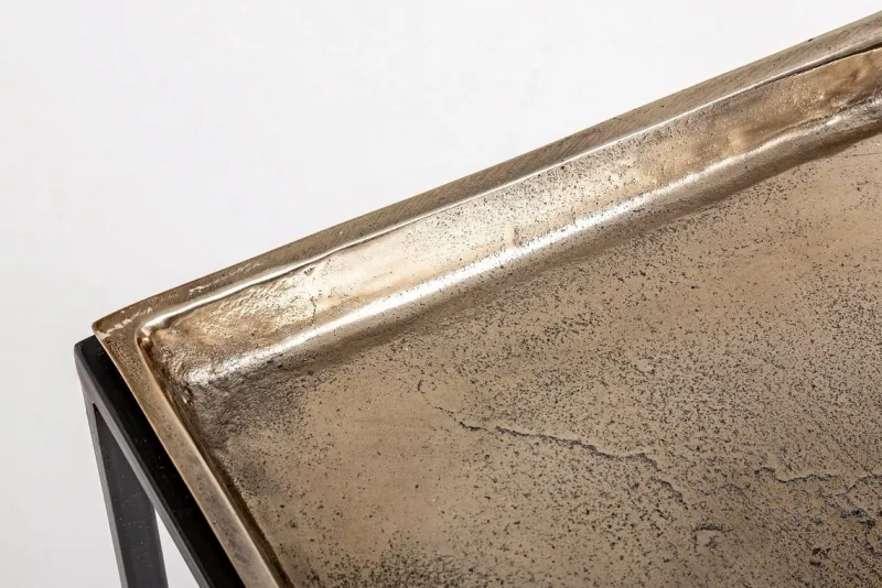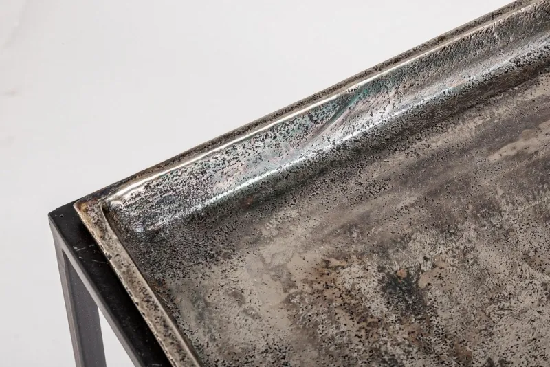 STRUTTURA IN ACCIAIO VERNICIATA A POLVERE EPOSSIDICA. PIANO IN ALLUMINIO CON FINITURA PLACCATA ED ANTICATA.