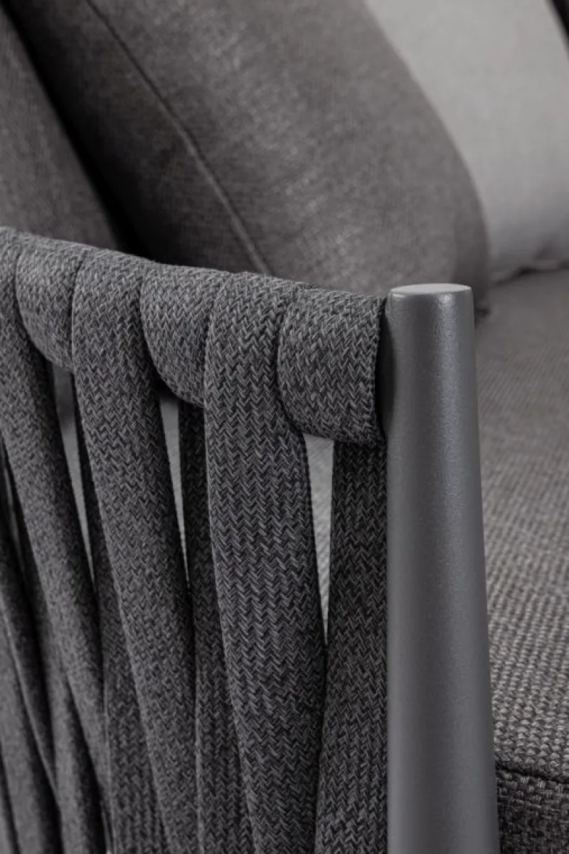 STRUTTURA IN ALLUMINIO VERNICIATO A POLVERE (POLIESTERE). INTRECCIO CON CORDE IN TETORON (100% POLIESTERE) CON IMBOTTITURA IN GOMMA (POLIETILENE). CUSCINI SEDUTA E SCHIENALE SFODERABILI IN TESSUTO IDROREPELLENTE OLEFIN (100% POLIPROPILENE).