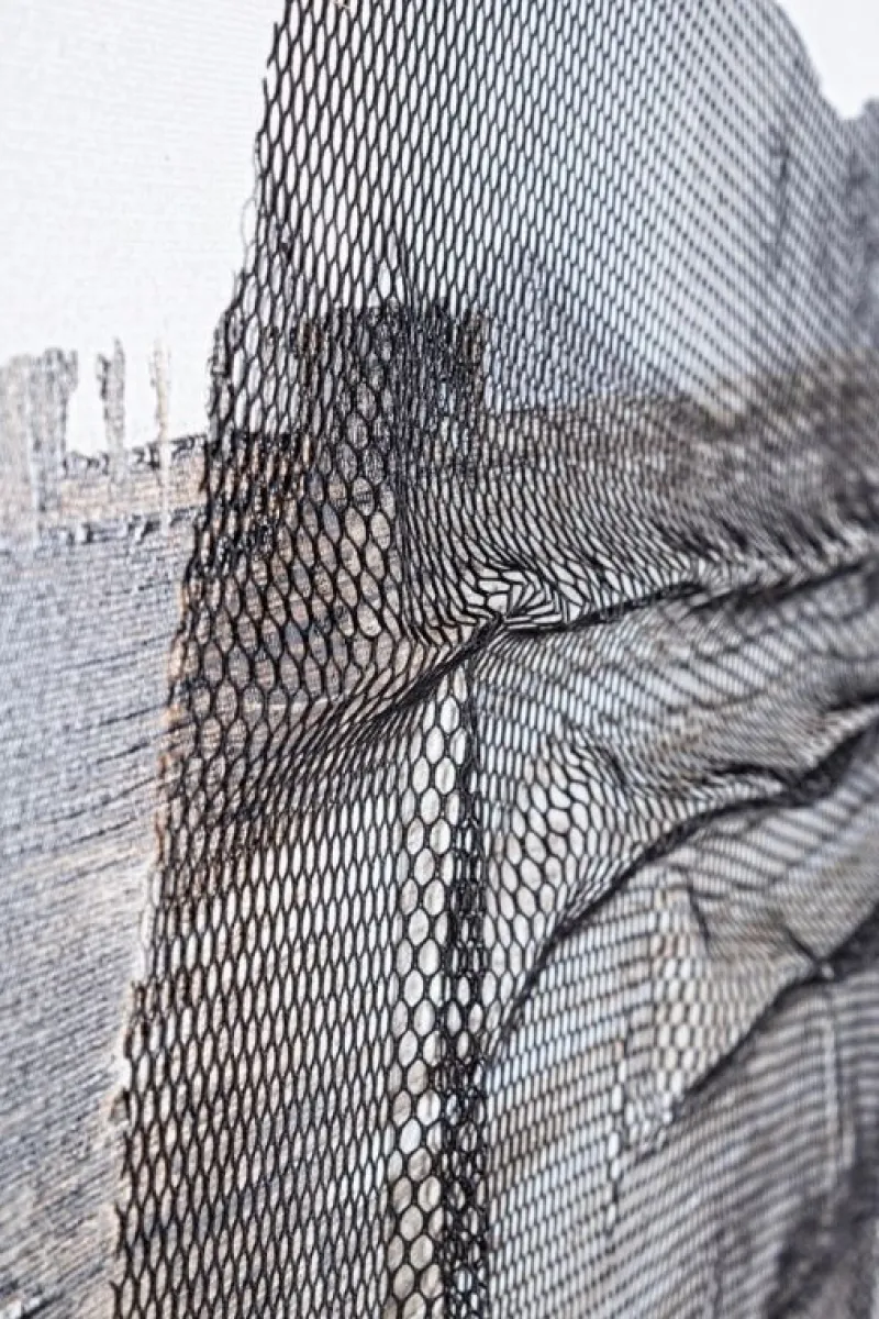 DIPINTO SU TELA CON APPLICAZIONI METALLICHE, STRUTTURA IN LEGNO DI ABETE. CORNICE IN PLASTICA.