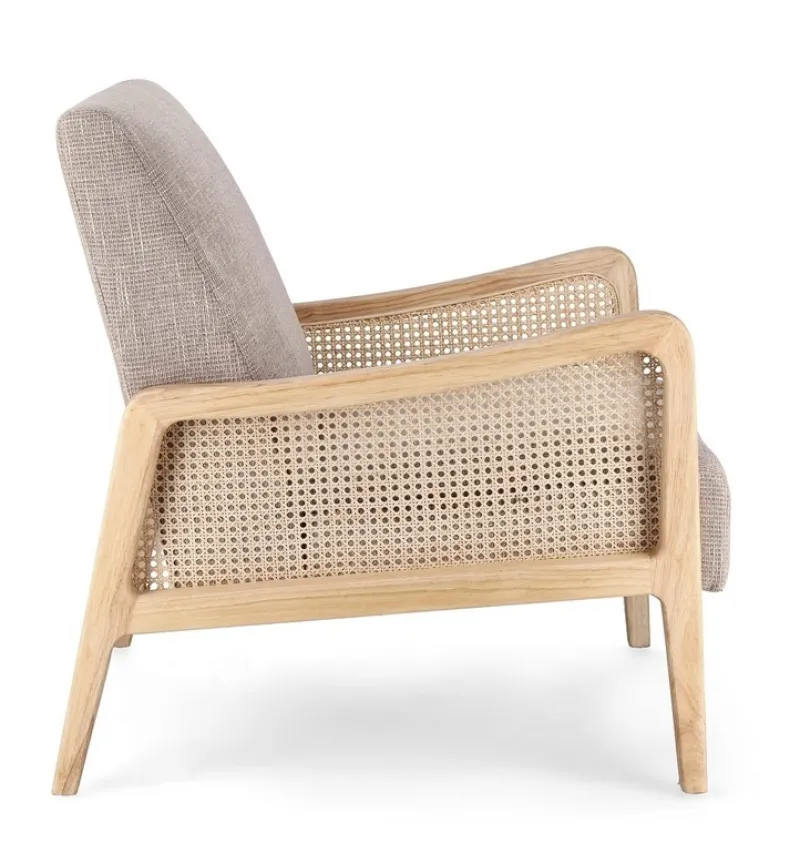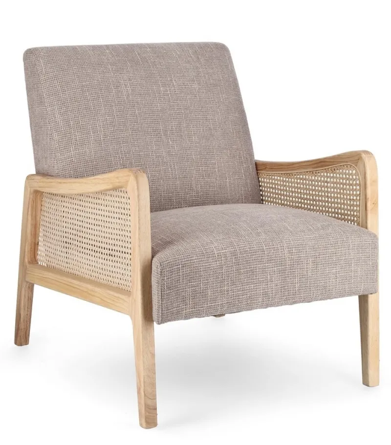 STRUTTURA IN LEGNO DI PINO E COMPENSATO. GAMBE IN RUBBERWOOD. BRACCIOLI CON INSERTI IN RATTAN. RIVESTIMENTO IN POLIESTERE. DENSITA’ IMBOTTITURA IN SCHIUMA POLIURETANICA 24 KG/M3. NON SFODERABILE. GAMBE DA ASSEMBLARE.