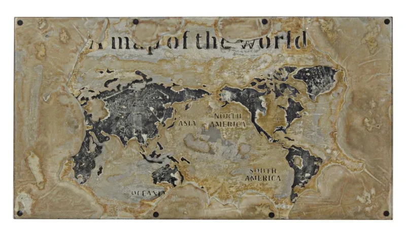 STRUTTURA IN ACCIAIO ANTICATO, PIANO IN VETRO E MDF CON DECORAZIONE IN CEMENTO. GAMBE DA ASSEMBLARE.
