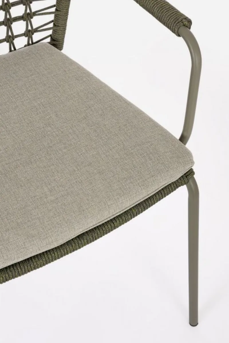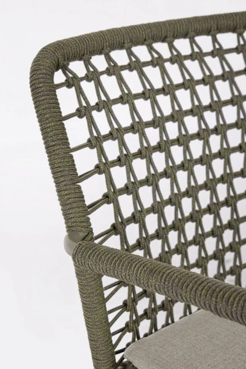 STRUTTURA IN ACCIAIO INOSSIDABILE (201). INTRECCIO PER ESTERNO IN CORDA (POLIPROPILENE). CUSCINI SFODERABILI IN TESSUTO IDROREPELLENTE SUNPROOF OLEFIN (100%POLYPROPYLENE). IMPILABILE.