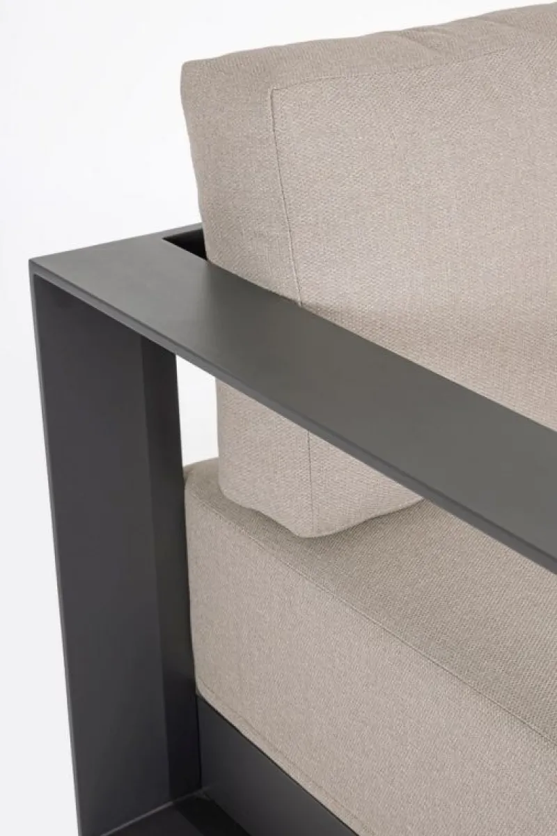 STRUTTURA IN ALLUMINIO VERNICIATO A POLVERE (POLIESTERE). CUSCINI SEDUTA E SCHIENALE SFODERABILI CON TESSUTO IDROREPELLENTE OLEFIN (100% POLIPROPILENE). PIEDINI REGOLABILI. GAMBE TAVOLINO (VITERIA IN ACCIAIO INOSSIDABILE) DA ASSEMBLARE.