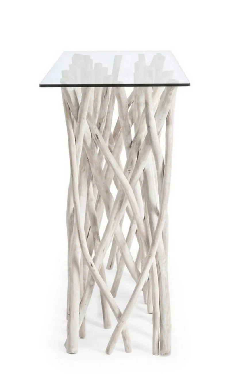 RAMI DI TEAK SBIANCATO CON FINITURA A BASE DI NITROCELLULOSA. VETRO NON TEMPERATO 8MM. SOLO PER USO INTERNO.