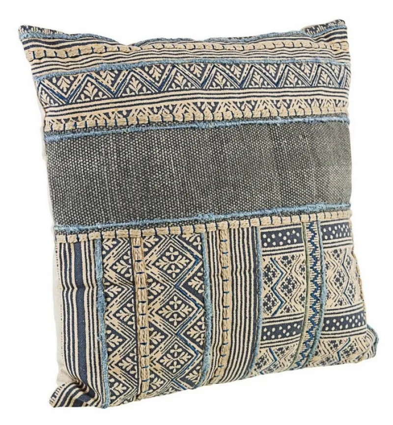 RIVESTIMENTO IN COTONE LAVORATO E RICAMATO A MANO, IMBOTTITURA IN POLIESTERE. PRODOTTO ARTIGIANALMENTE, STAMPA MANUALE TRAMITE TIMBRO, RICAMATA E CUCITA A MANO. INNER SENZA CARTONE.
