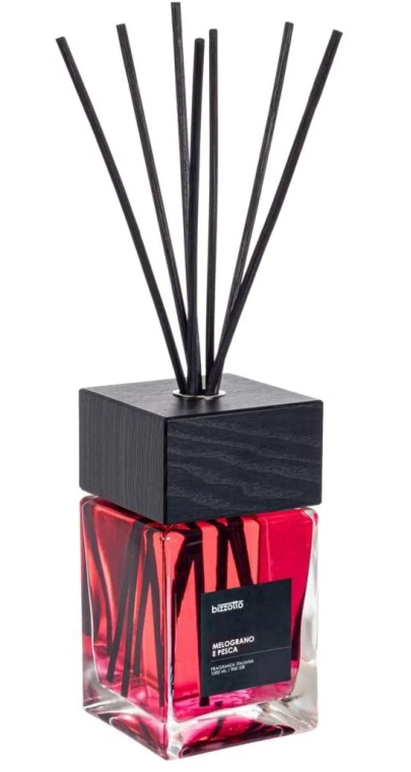 MELOGRANO E PESCA FRAGRANZA PER AMBIENTI CON 6 BASTONCINI NERI (H 40 CM). PROFUMO APPARTENENTE ALLA FAMIGLIA DEI FRUTTATI. BOTTIGLIA IN VETRO, FORMATO 1000 ML. CONTROTAPPO IN PLASTICA E TAPPO DECORATIVO IN LEGNO NERO. AREA DI COPERTURA DA 80 FINO A 120 MQ. MIX FRIZZANTE DI FRUTTA MEDITERRANEA ED ESOTICA. FRAGRANZA CONSIGLIATA PER LA CUCINA ED IL SOGGIORNO. LIQUIDO E VAPORI