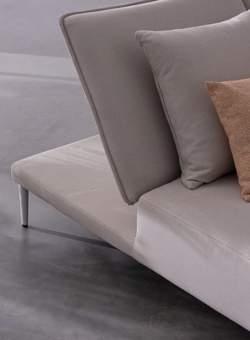 STRUTTURA IN ALLUMINIO. SEDUTA E SCHIENALE (RECLINABILE IN LIBERA POSIZIONE) NON SFODERABILI IN TESSUTO PER ESTERNO IN OLEFIN (100% POLIPROPILENE, 285GR/M2), IDROREPELLENTE E RESISTENTE AI RAGGI UV (GRADO 7), IMPERMEABILIZZATO INTERNAMENTE CON RIVESTIMENTO IN TESSUTO (POLIURETANO). IMBOTTITURA IN SCHIUMA POLIURETANICA, DENSITA’ 40KG/M3. INCLUSO DI