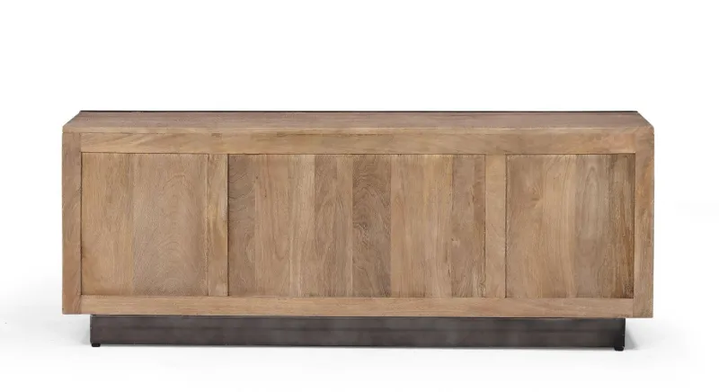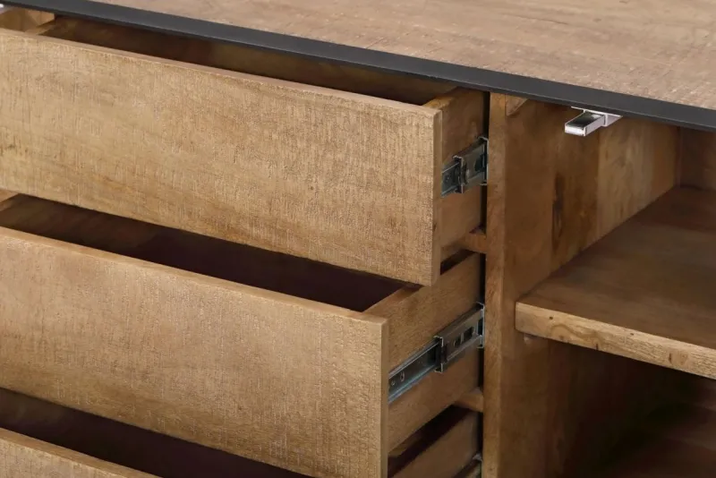 STRUTTURA IN LEGNO DI MANGO, FINITURA FINALE CON VERNICE A BASE D’ACQUA. PROFILO FRONTALE E GAMBE IN ACCIAIO VERNICIATO A POLVERE EPOSSIDICA. ANTE E CASSETTI CON CERNIERE CON CHIUSURA AMMORTIZZATA. VANO PORTA COMPRENSIVO DI MENSOLA.