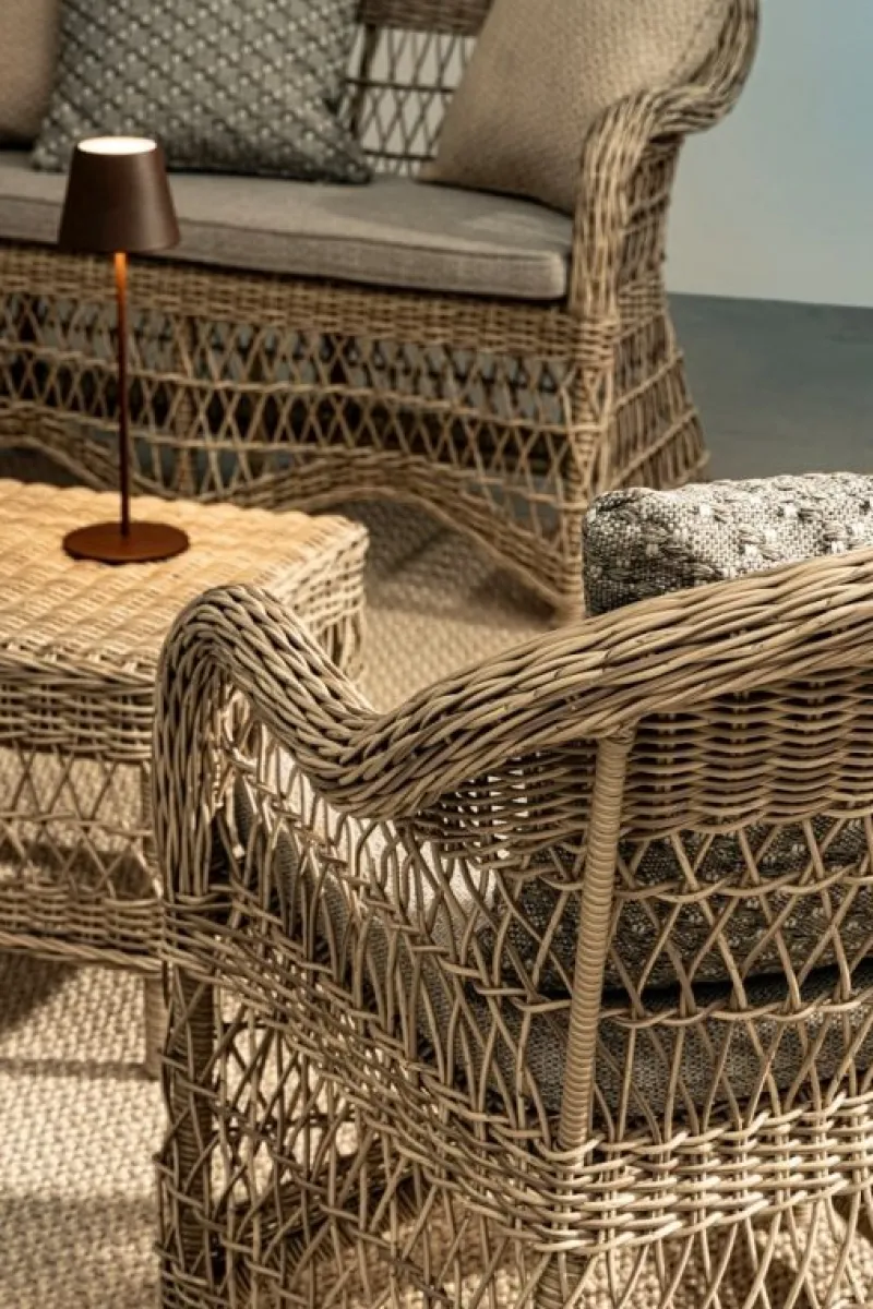 STRUTTURA IN ALLUMINIO VERNICIATO A POLVERE (POLIESTERE), INTRECCIO IN FIBRA SINTETICA (TONDO 5, 3MM).CUSCINI SFODERABILI CON TESSUTO IDROREPELLENTE SUNPROOF OLEFIN (100%POLYPROPYLENE). IMBALLO SENZA CARTONE.