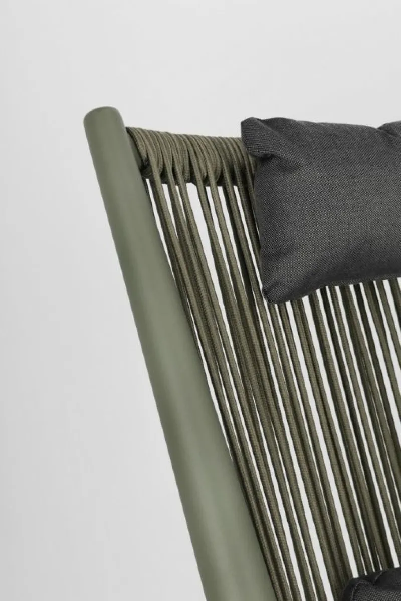 STRUTTURA IN ALLUMINIO VERNICIATO A POLVERE (POLIESTERE), INTRECCIO CON CORDE IN POLIESTERE (IDROREPELLENTI, RESISTENTI RAGGI UV). CUSCINI SFODERABILI IN TESSUTO IDROREPELLENTE POLIESTERE (280GR/M2). DA ASSEMBLARE.