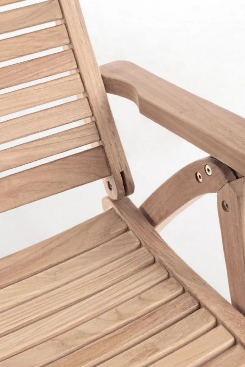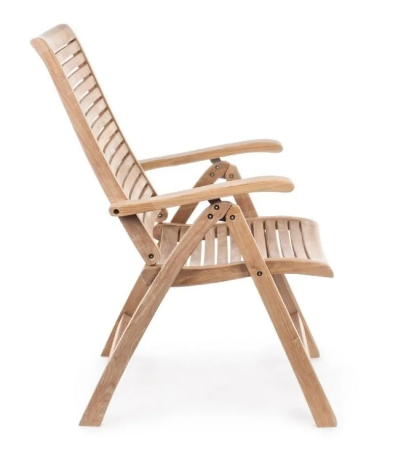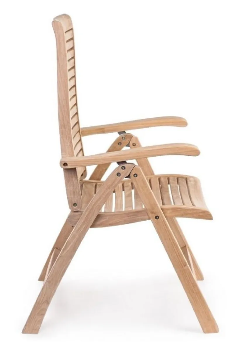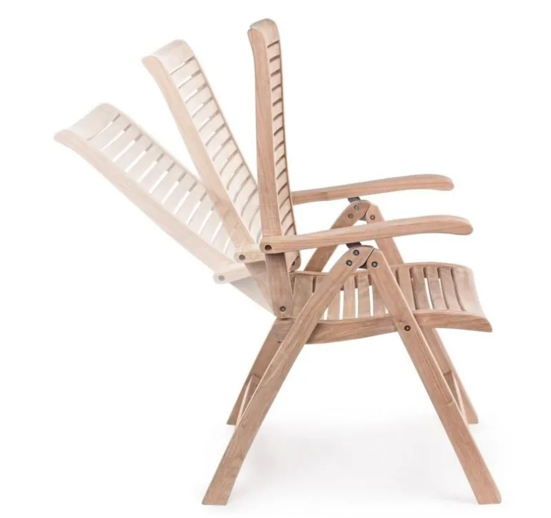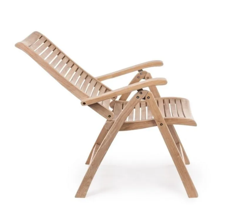LEGNO TEAK (CLASSE A) – SVLK (LEGNO CERTIFICATO PROVENIENTE DA FORESTE SOSTENIBILI), PRODUZIONE MECCANICA. FERRAMENTA IN ACCIAIO GALVANIZZATO. SCHIENALE RECLINABILE (5 POSIZIONI). PIEGHEVOLE.