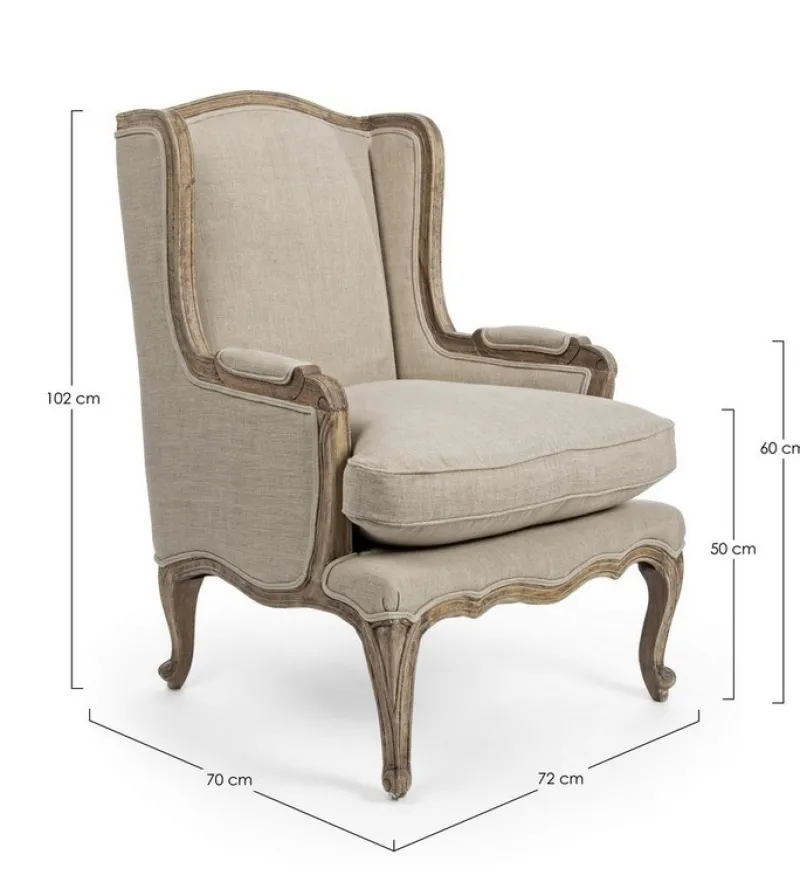 STRUTTURA IN LEGNO DI MANGO MASSICCIO INVECCHIATO. RIFINITURA CON VERNICE NITROCELLULOSA OPACA. RIVESTIMENTO IN LINO, CUSCINO SEDUTA SFODERABILE, IMBOTTITURA IN POLIESTERE. SOSPENSIONE CON CINGHIE ELASTICHE.