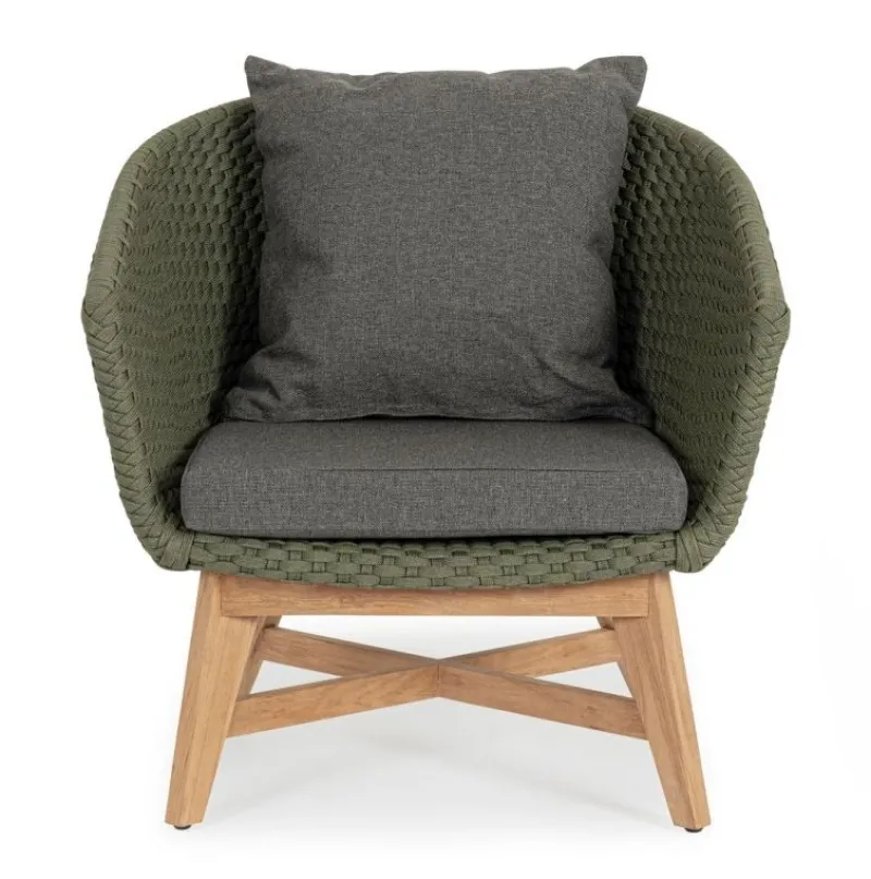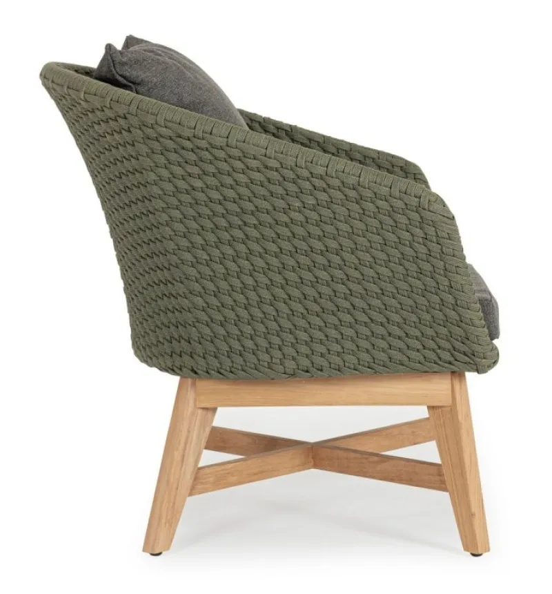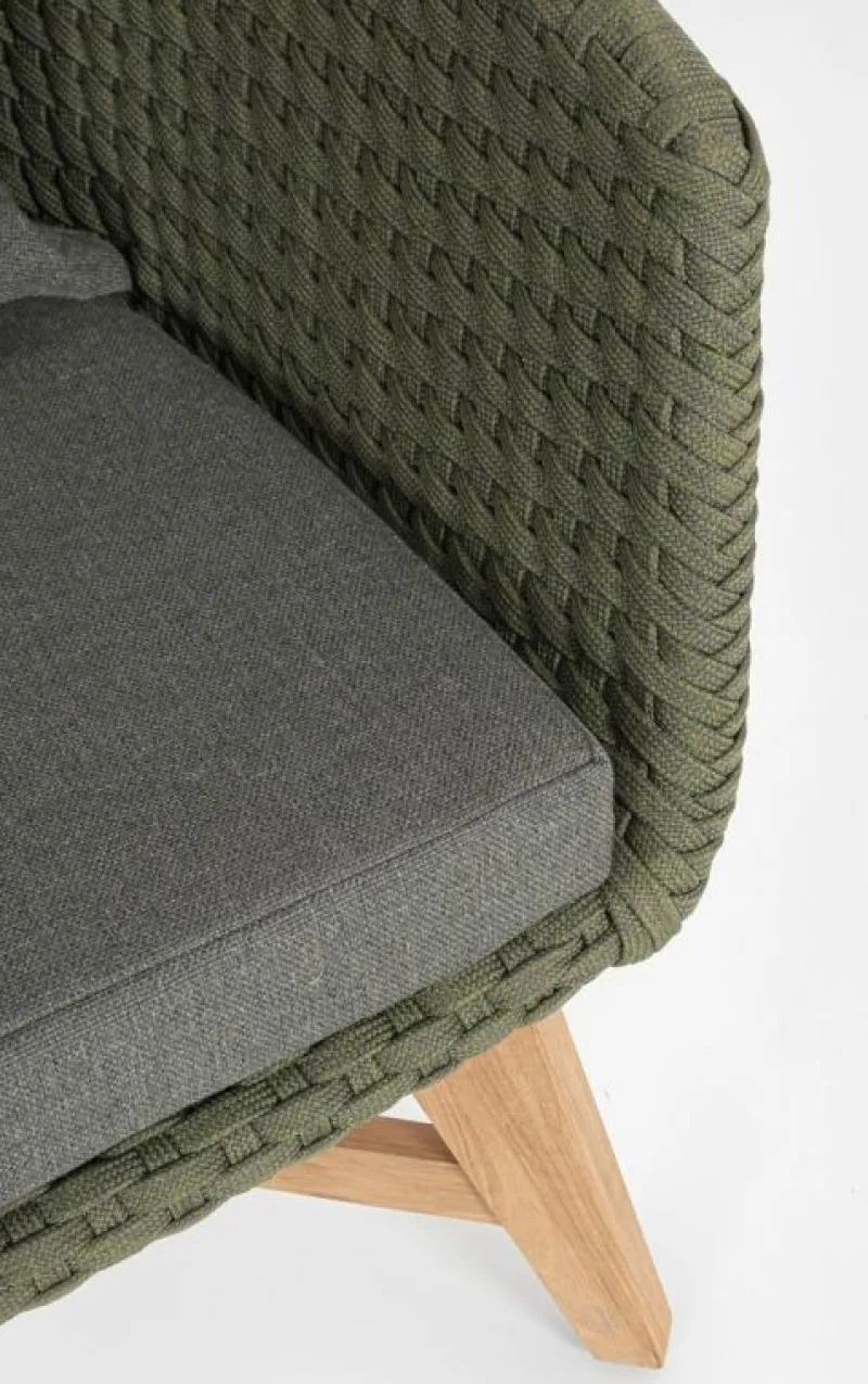 SEDUTA CON STRUTTURA IN ALLUMINIO VERNICIATA A POLVERE (POLIESTERE). INTRECCIO IN CORDA OLEFIN (100% POLIPROPILENE). CUSCINO SEDUTA E SCHIENALE SFODERABILE CON TESSUTO IDROREPELLENTE SUNPROOF OLEFIN (100% POLIPROPILENE). GAMBE IN TEAK – SVLK (LEGNO CERTIFICATO PROVENIENTE DA FORESTE SOSTENIBILI). VITERIA IN ACCIAIO GALVANIZZATO. GAMBE DA ASSEMBLARE. ATTENZIONE: PRIMA DI PROCEDERE AL MONTAGGIO, ASSICURARSI CHE LA NUMERAZIONE SEDUTA-GAMBE COINCIDA.