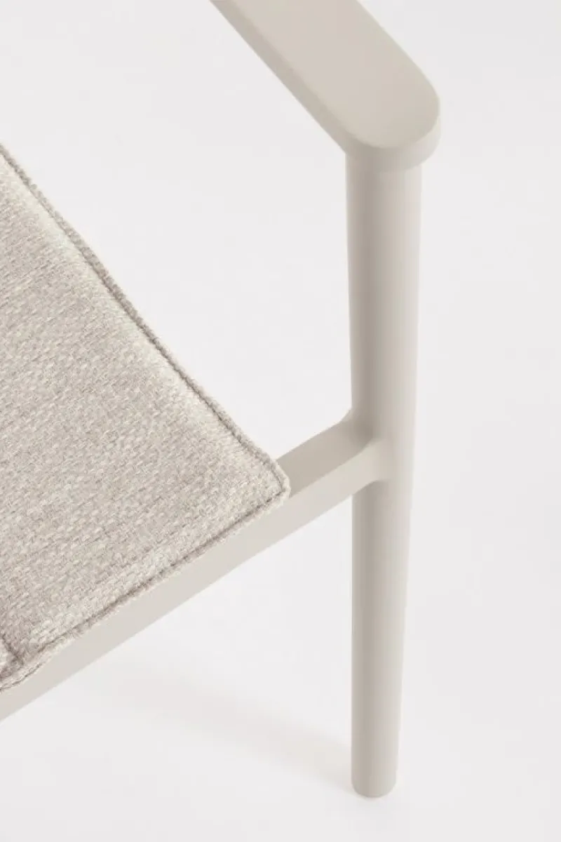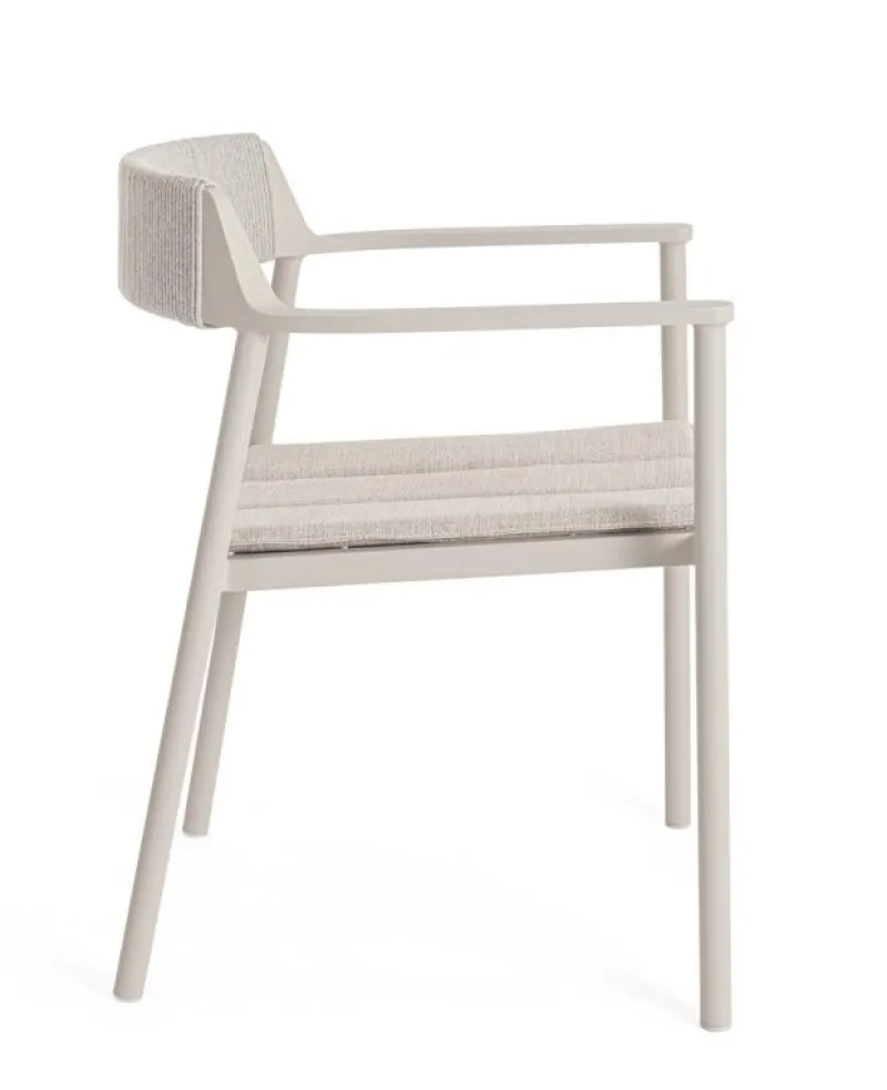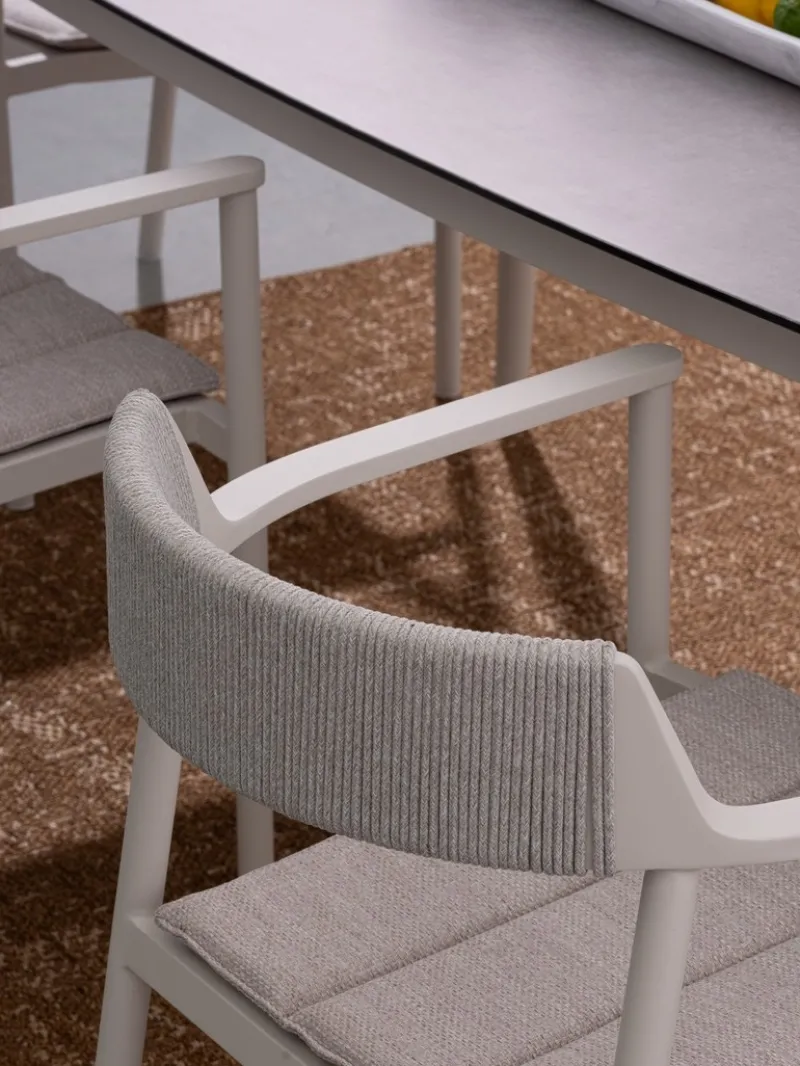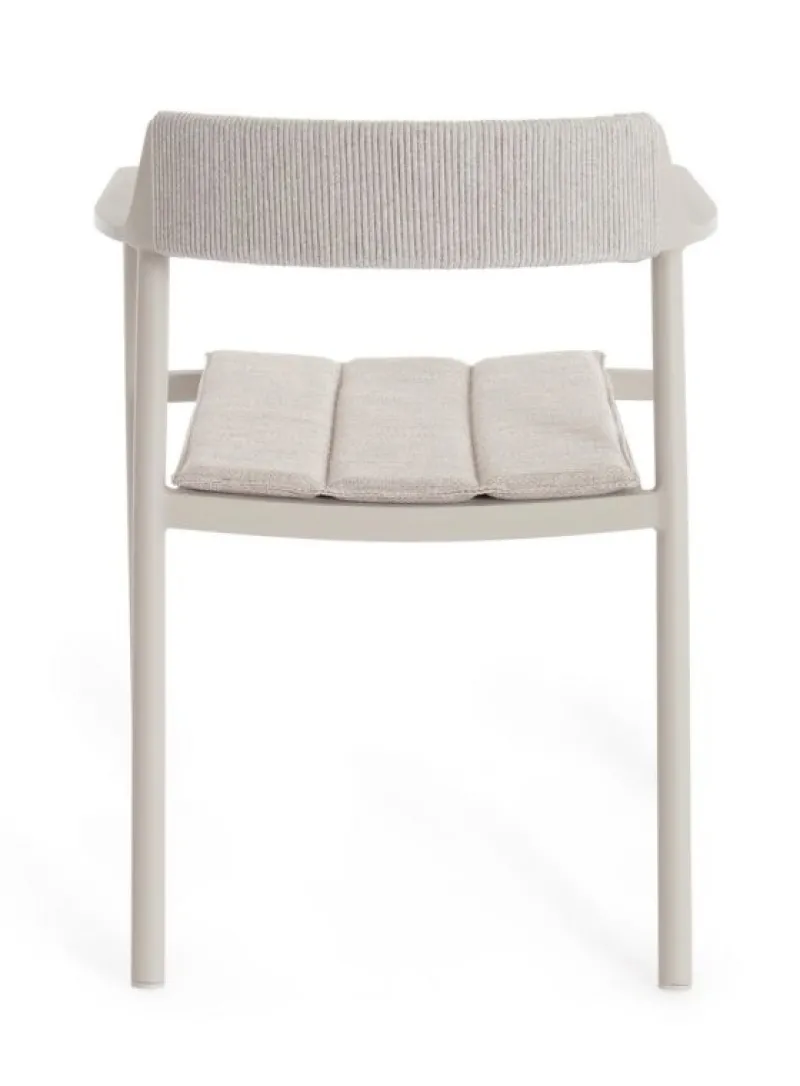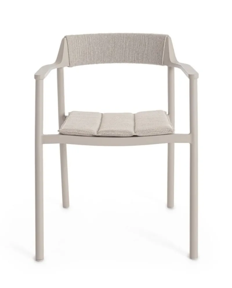 STRUTTURA IN ALLUMINIO VERNICIATO A POLVERE (POLIESTERE). SCHIENALE CON INTRECCIO IN CORDA DI POLIESTERE. CUSCINO SEDUTA SFODERABILE CON TESSUTO IDROREPELLENTE OLEFIN (100% POLIPROPILENE). IMPILABILE.