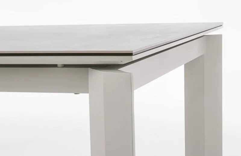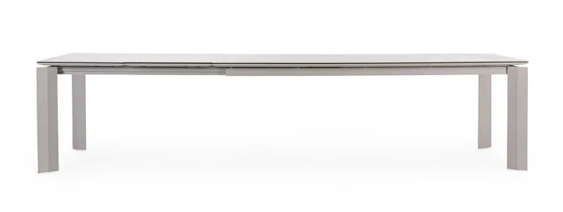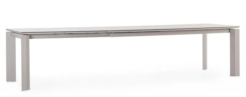 STRUTTURA IN ALLUMINIO VERNICIATO A POLVERE (POLIESTERE). PIANO IN CERAMICA (CON BASE IN VETRO) SPESSORE TOTALE 9MM. ALLUNGABILE CON APERTURA TELESCOPICA. PROLUNGHE ESTERNE CON ALLOGGIO SOTTO IL PIANO. VITERIA IN ACCIAIO INOSSIDABILE. GAMBE DA ASSEMBLARE.
